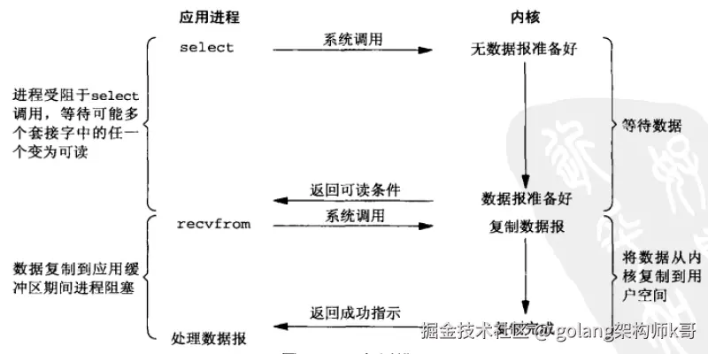 IO复用在linux中包括select、poll、epoll模型三种,这三个IO复用模型有各自的API实现,以select模型为例,调用select函数,进程进入阻塞, 同时监控多个套接字描述符的状态 ,当有数据报变为可读或阻塞超时才返回,接着进程可调用recvfrom接收数据报到应用进程缓冲区。