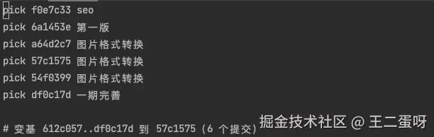 git rebase -i HEAD~n,n为你想要合并的提交数量,例如我输入git rebase -i HEAD~6,会出现下图的交互页面。 - 将下面5个