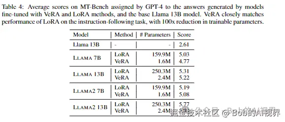 该论文基于Lora,提出了基于向量的随机矩阵自适应( VeRA ),与 LoRA 相比,它进一步减少了可训练参数的数量,但保持了相同的性能。模型达到了类似甚至更好的效果。