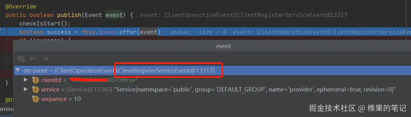 - 注册完服务之后,发布ClientRegisterServiceEvent事件到queue