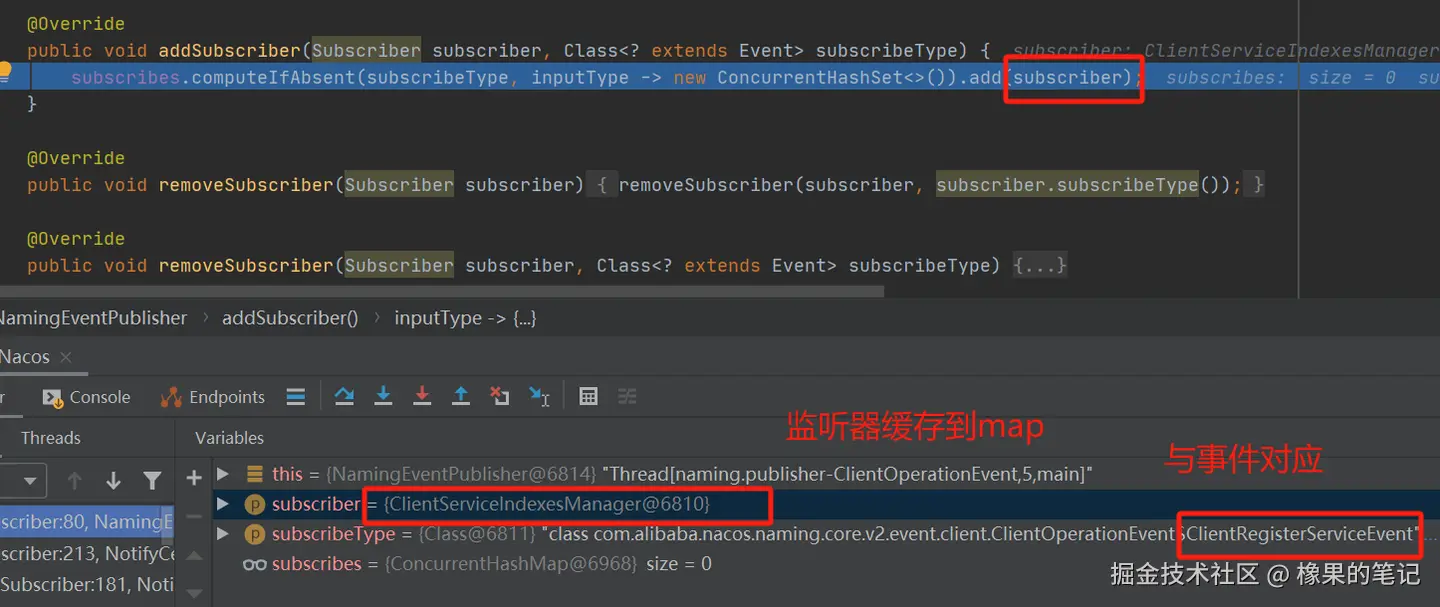 在前文中的NotifyCenter#addSubscriber流程中,ClientRegisterServiceEvent->ClientServiceIndexesManager这个订阅者的映射关系有保存到subscribes中。所以这里是可以根据事件获取到订阅者的。