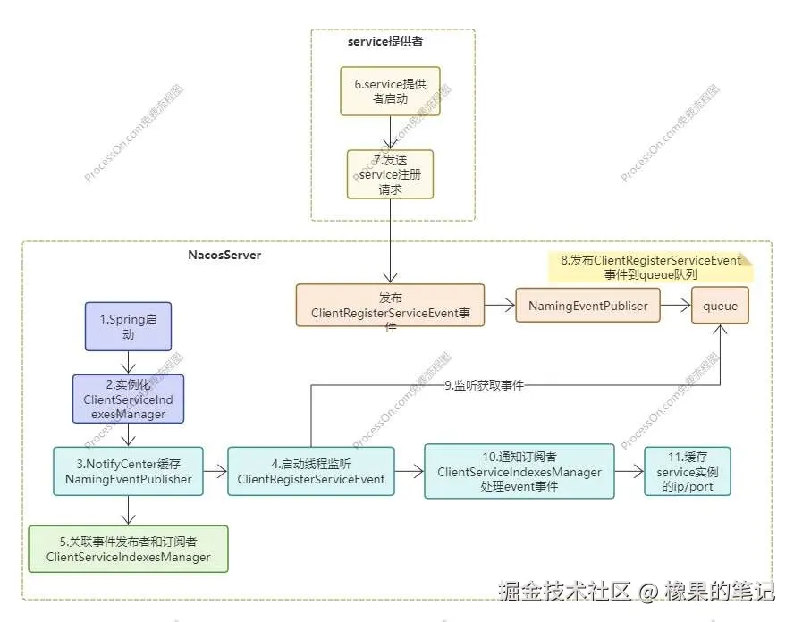 - 当启动服务提供者时,会发送注册服务事件到NacosServer端
