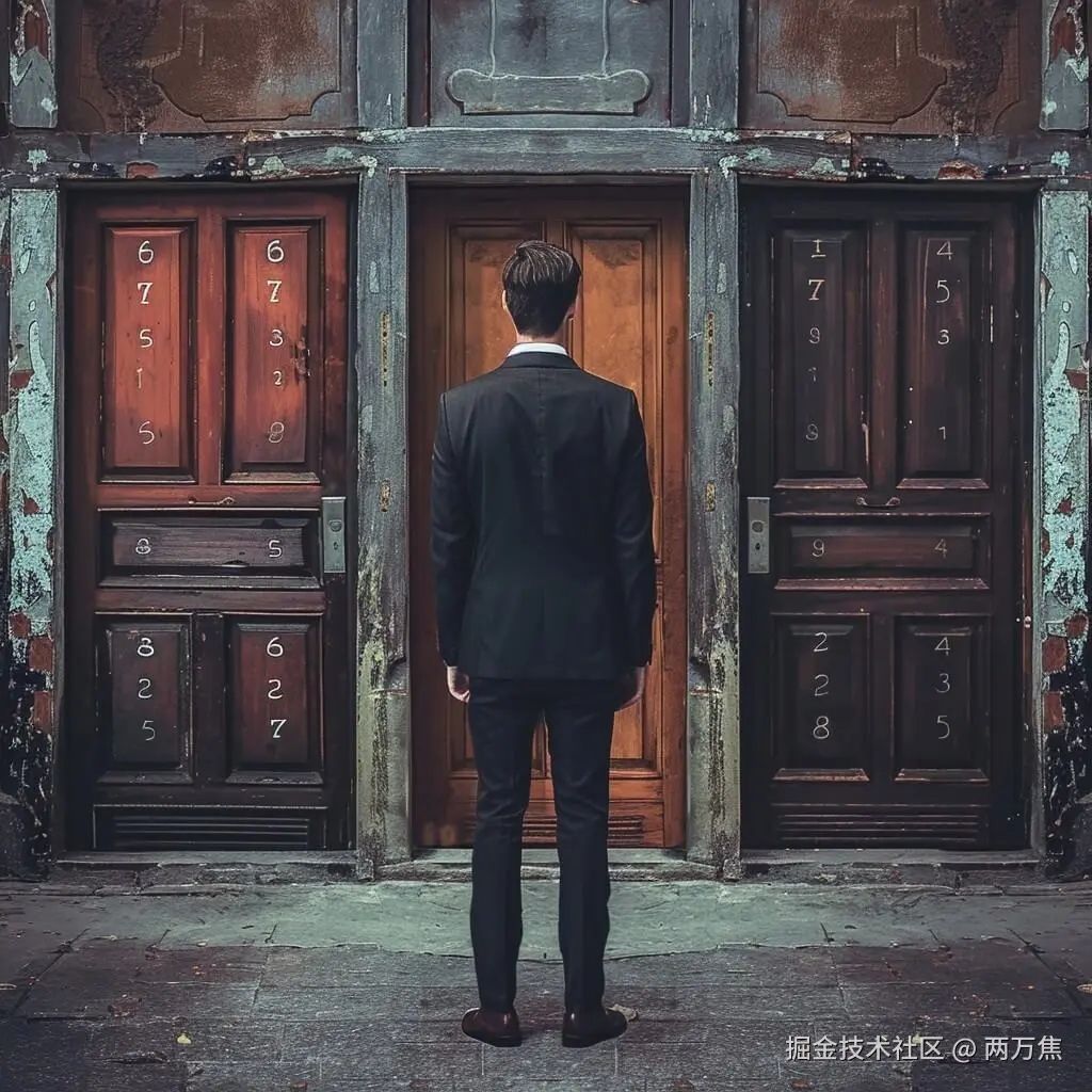 prompt: The image captures a moment of decision, as a man dressed in an elegant black suit contemplates which path to choose, represented by the three unique, vintage doors in front of him. Numbered elegantly, each door bears the marks of time and decisions past, hinting at the multitude of stories they could tell. The scene is a metaphor for life's crossroads, where each choice can lead to a distinct destiny, wrapped in the mystery of what lies beyond the threshold.