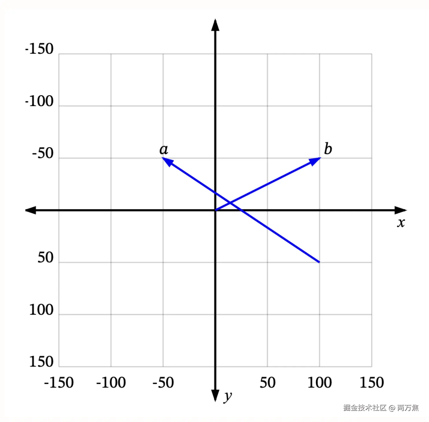 本质上是一个坐标,用来描述空间中一个点到另一个点的移动,比如图片的中的 向量是从 (100, 50) 移动到到 (-50, -50) , 向量是从 (0, 0) 到 (100, -50)