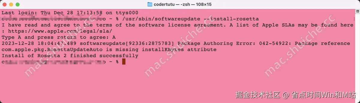 输入命令后,会提示输入A然后回车确认安装,终端将显示有关Rosetta的安装进程。完成后,你可以安全地关闭终端。
