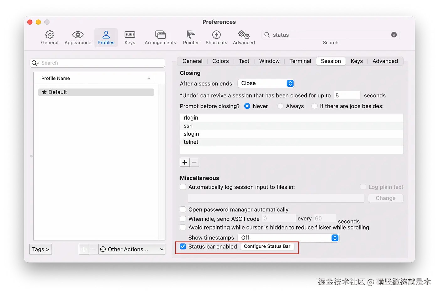 - 转到 Profiles 选项卡并选择 Session 选项卡。