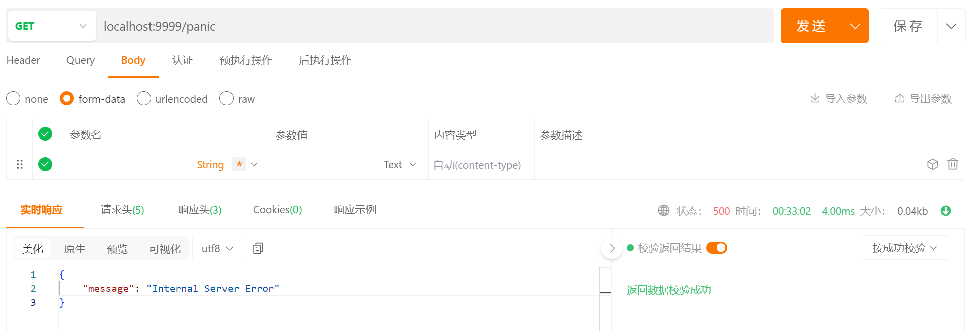 错误机制设计很简单,即在 panic 发生时,向用户返回 Internal Server Error,并且在日志中打印必要的错误信息,方便进行错误定位。