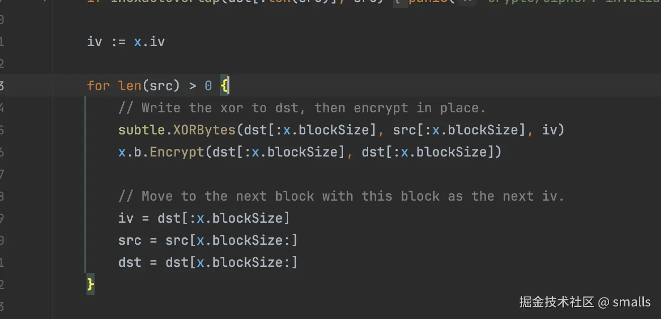 - cbc模式 待加密前16位字节跟iv进行异或,公式:src[0:16] ^ iv[0:16],下图就是go的cbc源码