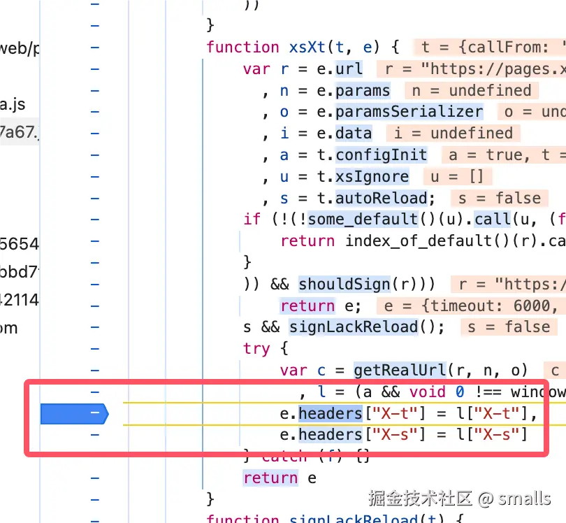 - 断点位置1,我们在这里进行断点,这样xs就只执行一次,有利于分析,有能力的话,也可以补环境进行分析