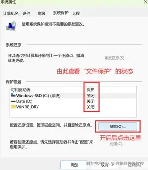 找到正确的渠道进入“设置”,在搜索框内搜索“系统还原”,点击下方的“创建还原点”,就会弹出“系统保护界面”。在页面里可以查看电脑文件保护功能的状态。如显示“已开启”,单击“配置”按钮后进入新页面继续操作即可;未开启则可直接跳过该方法。