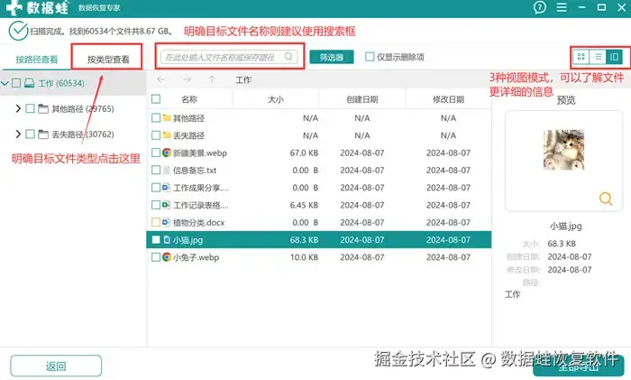 第3步: 如果明确需要恢复的文件类型,可以直接在左边点击“按类型查看”;如果明确目标文件的名称则可以直接使用搜索框定位目标文件。