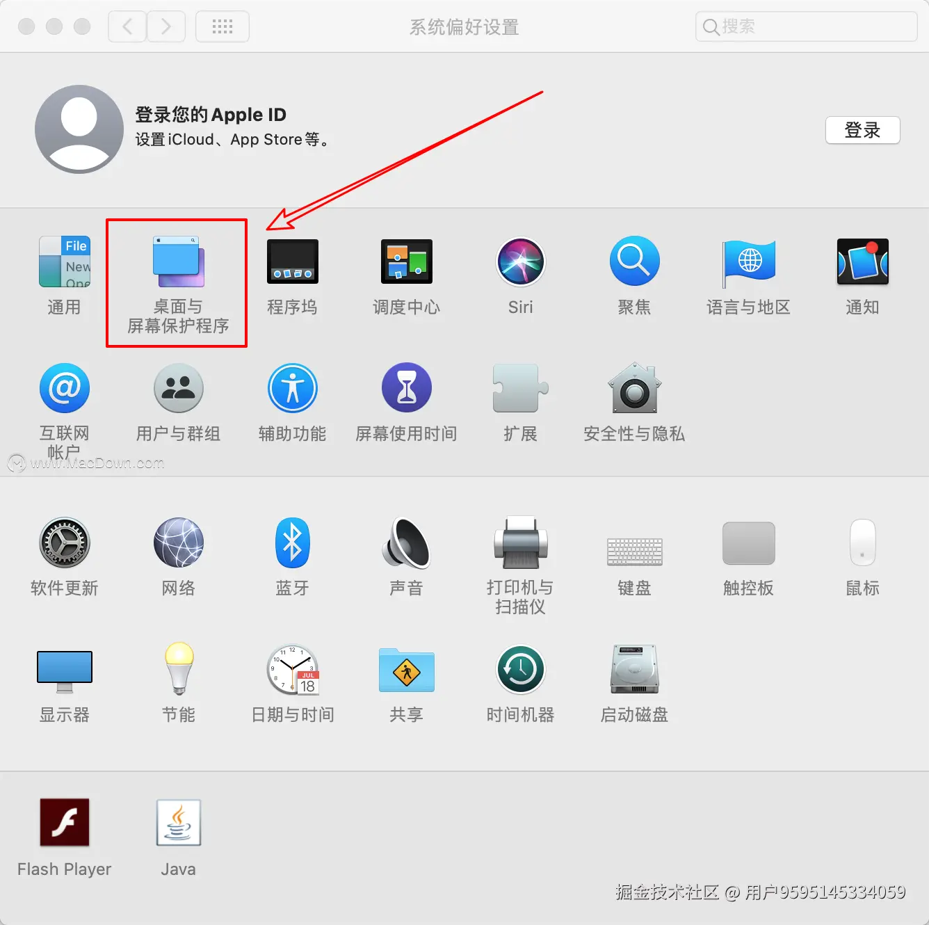 一、打开系统偏好设置,点击桌面与屏幕保护程序