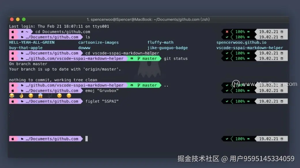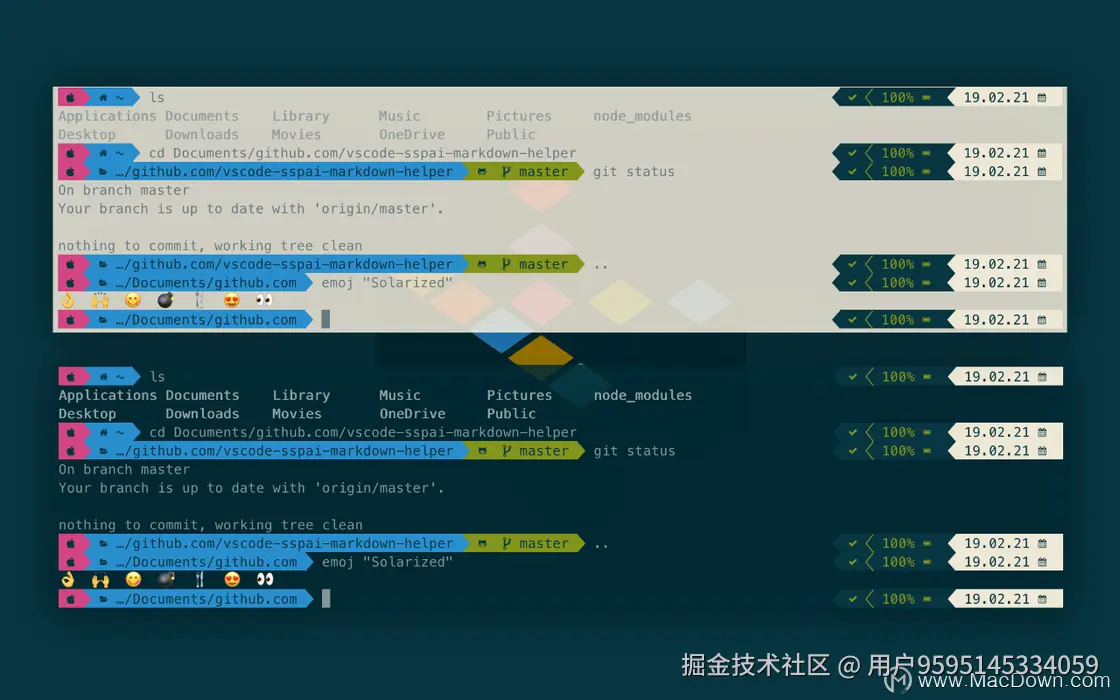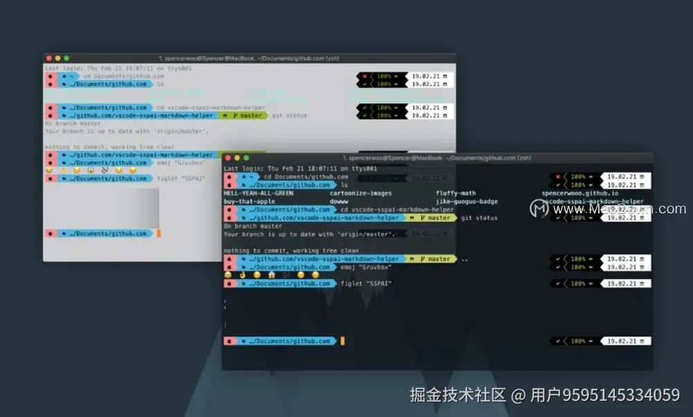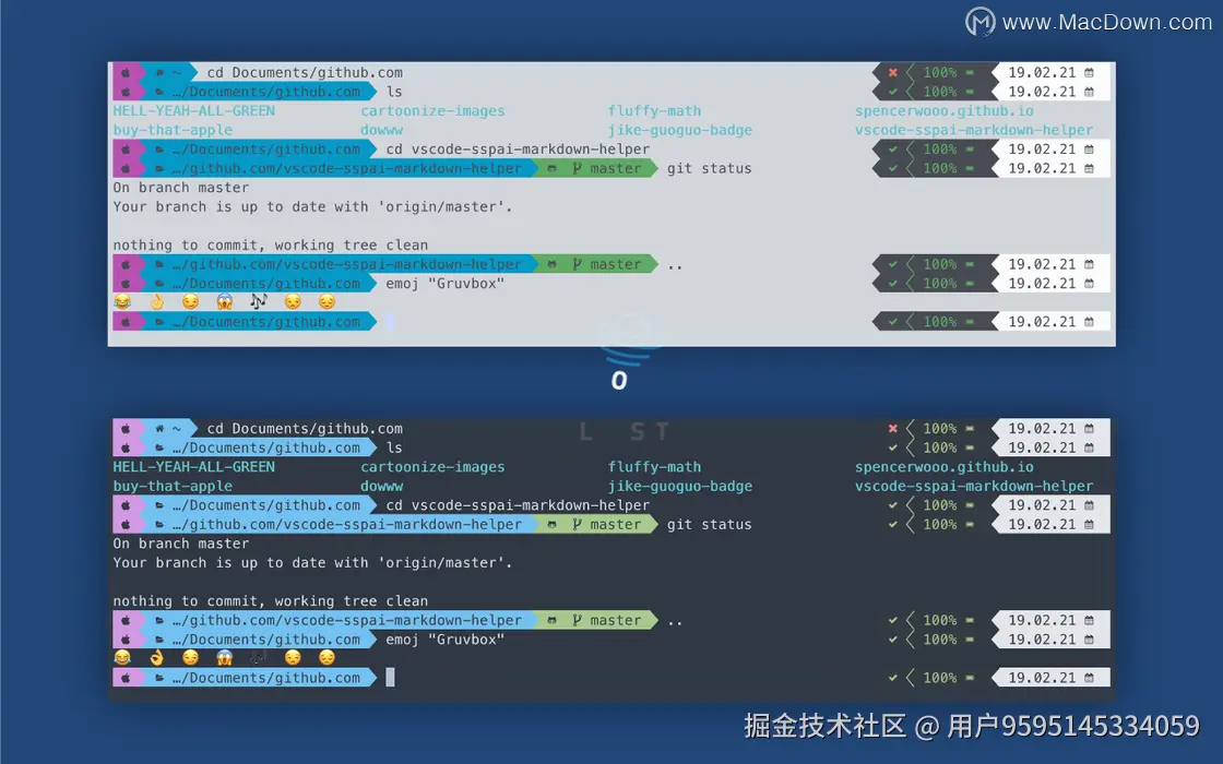 遗憾的是上面提到的主题库中仅有 Gruvbox Dark 这一种配色供我们选择,也就是上面截图中的颜色方案,配置文件名称为 Gruvbox Dark.terminal。不过如果你使用 iTerm2,你可以在 morhetz/gruvbox-contrib 这里下载到一亮一暗两种为 iTerm2 设计的主题配色方案的配置文件。