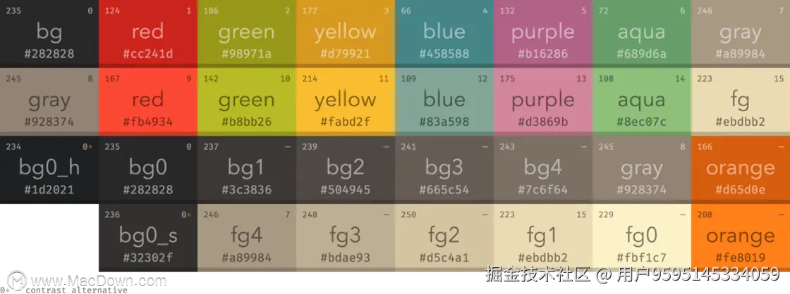 前有 Solarized 家族,后有 Gruvbox 配色。Gruvbox 是又一个经典的主题配色方案,这个主题有由低到高三种对比度的配色主题,Dark 和 Light 一暗一亮两种设计方向的配色方案,共六小种颜色搭配。和 Solarized 齐名,Gruvbox 可以说又是一大经典的配色方案。