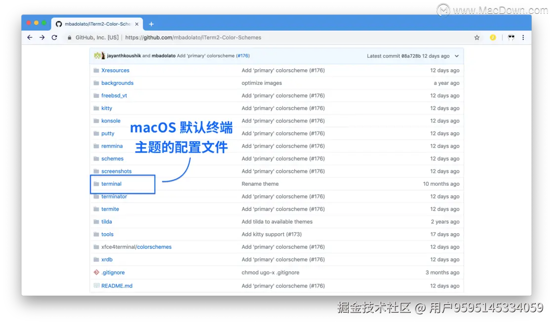 上面就是 iTerm2 Color Schemes 的 GitHub 项目内容,其中 terminal 文件夹下的主题文件是为 macOS 原生终端 Terminal 准备的主题。这其中以 .terminal 结尾的文件就是终端的主题配置文件。