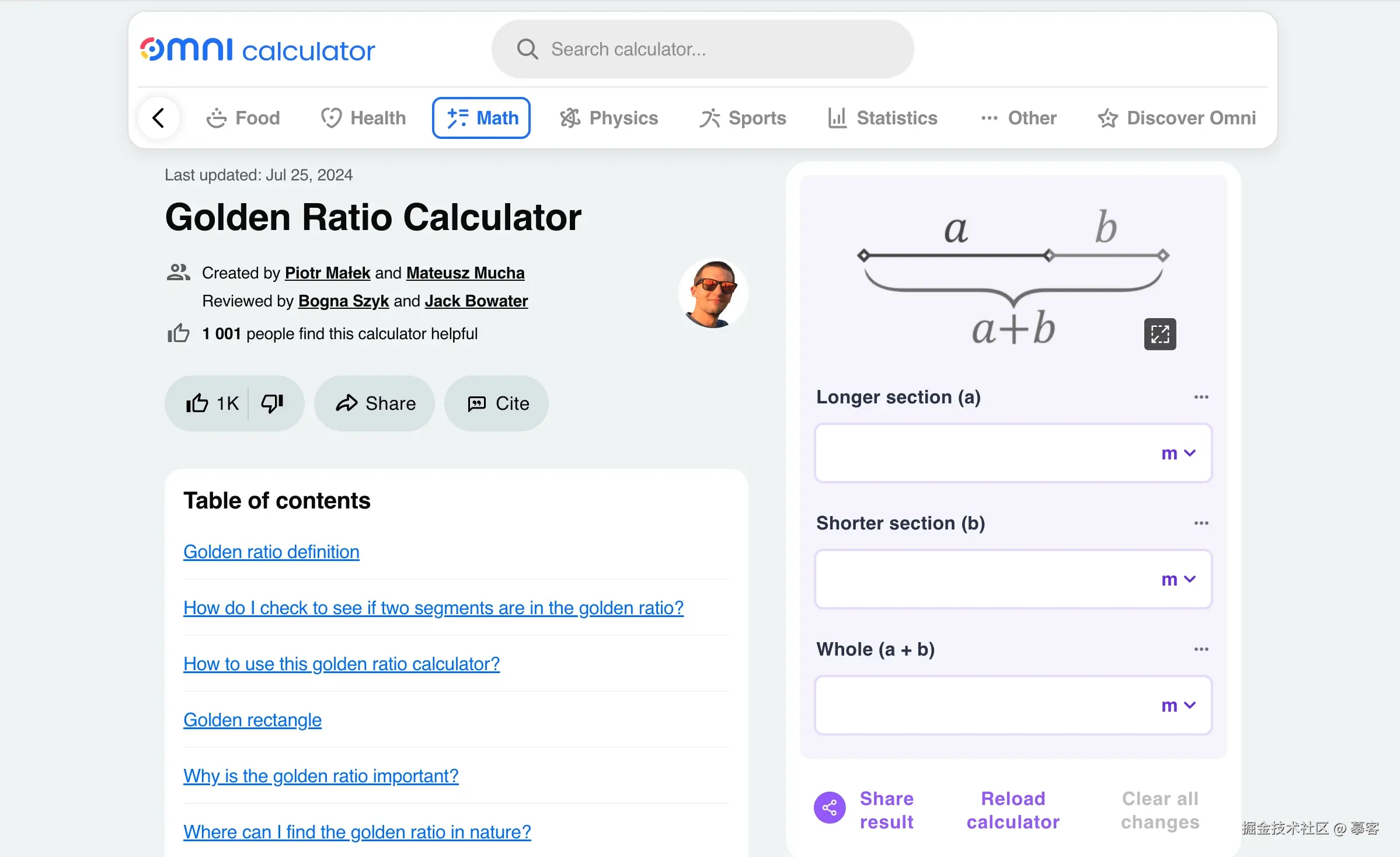 Golden Ratio Calculator(omnicalculator.com/math/golden…)是一款在线工具,只需输入一个数值,它就能自动计算出符合黄金比例的两个数值,方便设计师在设计中应用。