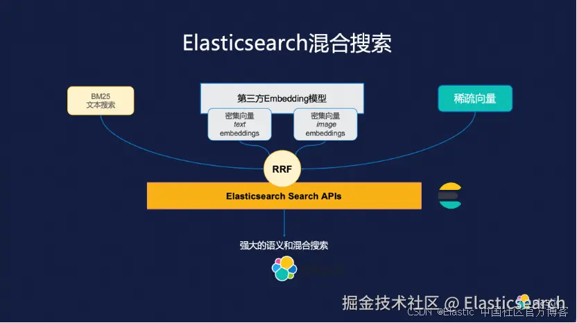 混合搜索策略是 ES 致力于优化的方向,旨在结合不同类型的向量处理与文本搜索能力,服务于广泛的使用场景。其中,“密集向量” 技术通过深度学习模型将文本映射到高维空间,实现语义理解;而 “稀疏向量” 则更贴近传统的关键词加权方法,如 BM25,尤其适用于文本搜索。通过结合两者,ES 不仅能够支持基于文本的查询,还能扩展至图像等多媒体内容的语义搜索,满足多样化需求