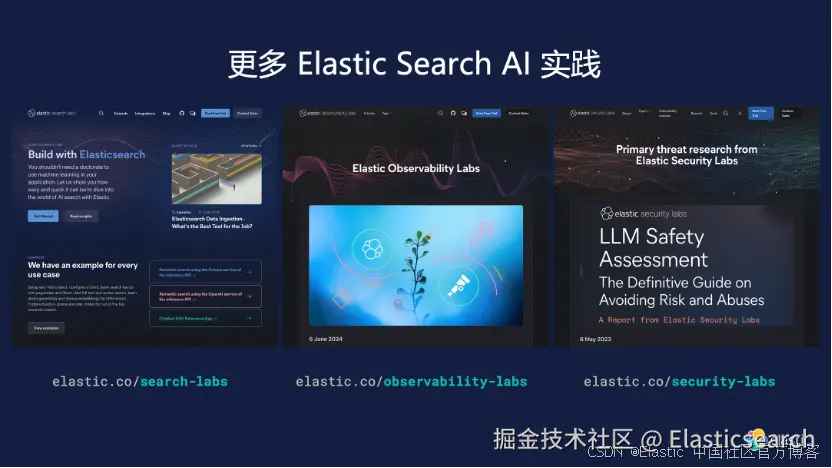 为促进技术交流与学习,我们提供了丰富的学习资源与实验室环境,涵盖搜索、安全等多个领域,鼓励开发者深入探索 ES 与 AI 结合的广阔应用前景,并通过技术社群加强实践交流,共同推动技术创新与发展。