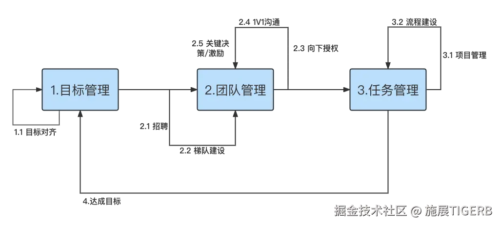 通过以上的管理动作,团队通常都能正常运转起来:输入目标->目标对齐->项目/团队管理->目标达成。这里可能管理者绝大多数的工作其实还是执行,并没有参与目标的制定与输出。
