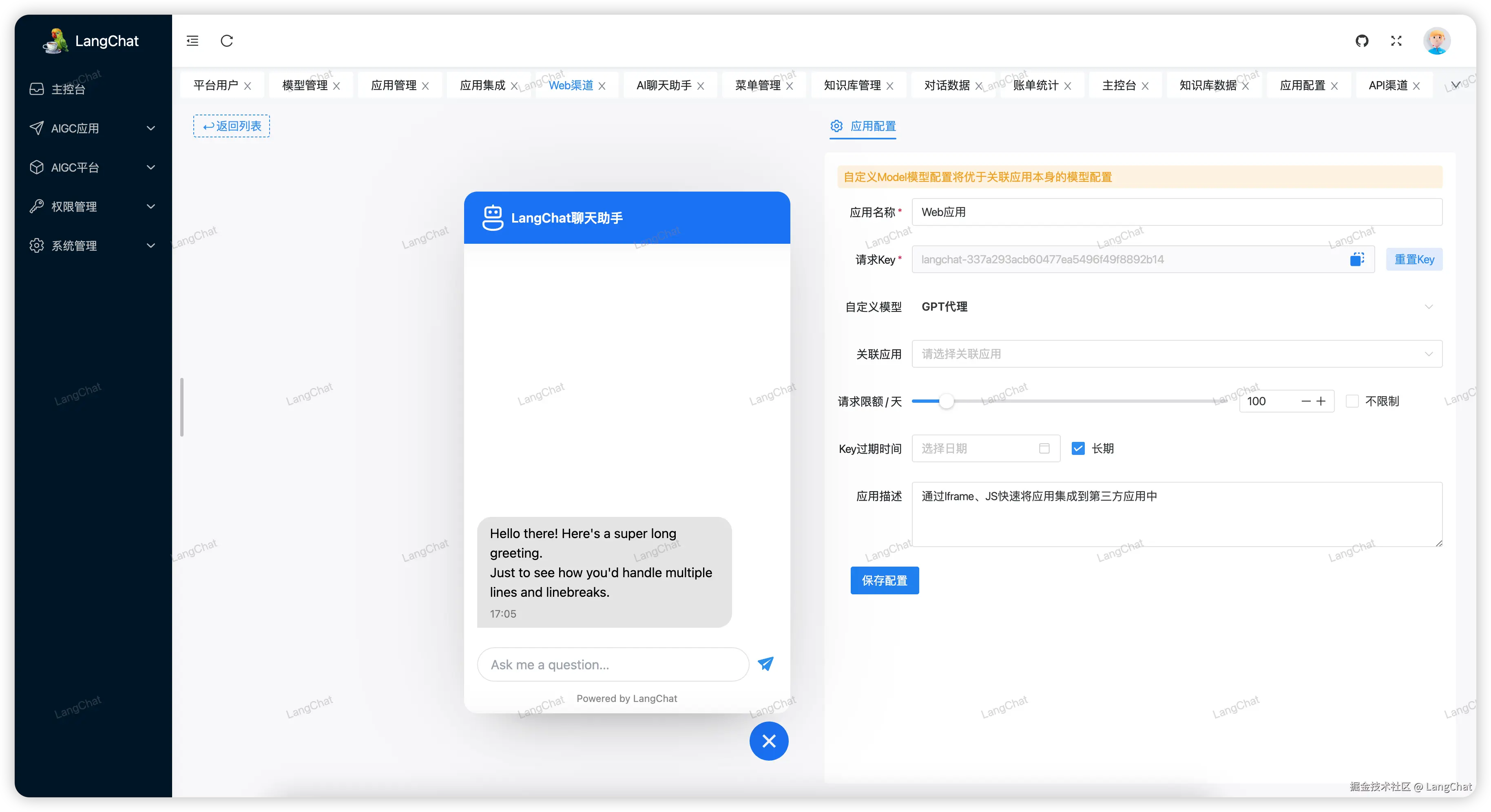我开源了一套Java生态AIGC知识库、Agent多模态平台应用 LangChat 2024-08-12 458 阅读1分钟 开源地址:github.com/TyCoding/la… 产品官网:langchat.cn Java生态的AIGC解决方案, 集成国内外数十家AI大模型、知识库检索、 Agent、FunctionCall、WebSearch、高级RAG, 快速构建企业机器人 支持WebSDK、API多渠道接入 支持OSS多存储方案 支持动态配置模型,无感刷新模型配置 支持Embedding本地化方案 感兴趣友友们可以点个star哦,可以进群