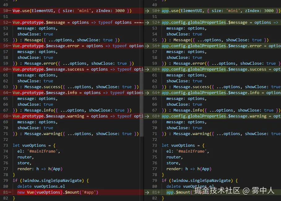 使用createApp 创建应用实例app,然后根据如下图所示的API,依次全局搜索并替换