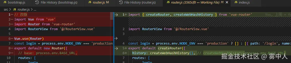 ① 改用“createRouter”方法创建实例,然后在bootstrap.js中引入并传递给use