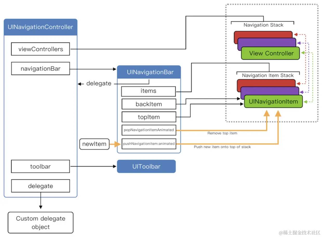 - UINavigationController有 viewControllers 对象,UINavigationBar有 items 对象,每一个 Controller 有自己的 UINavigationItem,可以对自己的UINavigationItem修改