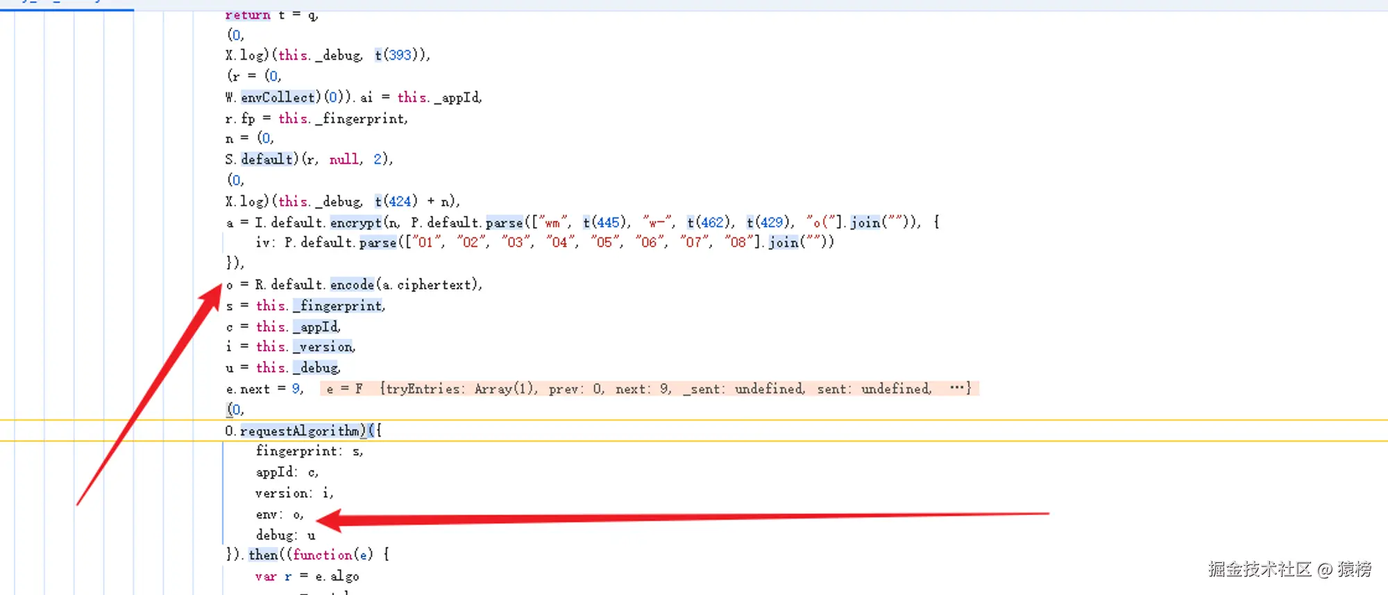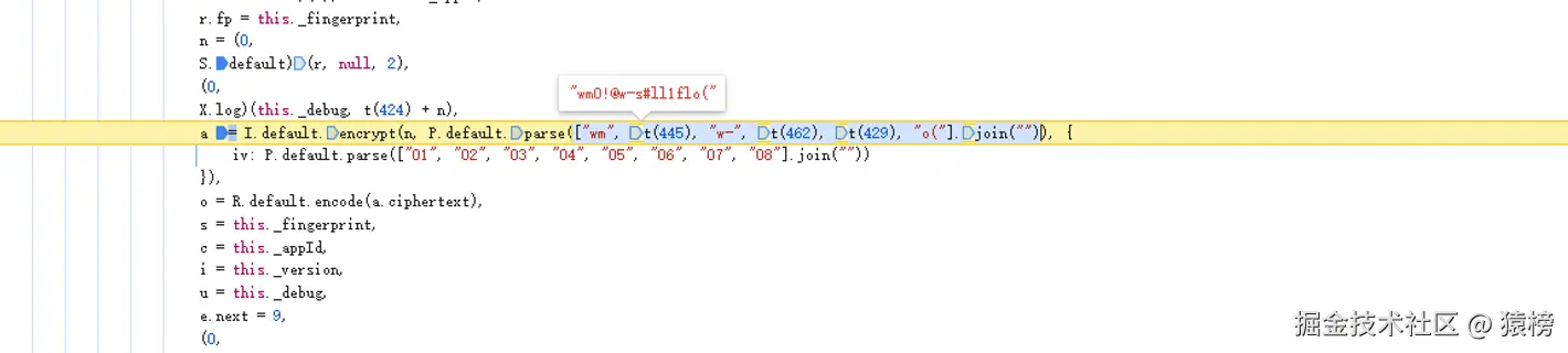 其实这里我们看到他传入已经是加密好的结果,由此推断在这之前已经是处理好的加密参数,我们通过堆栈往上查找分析。