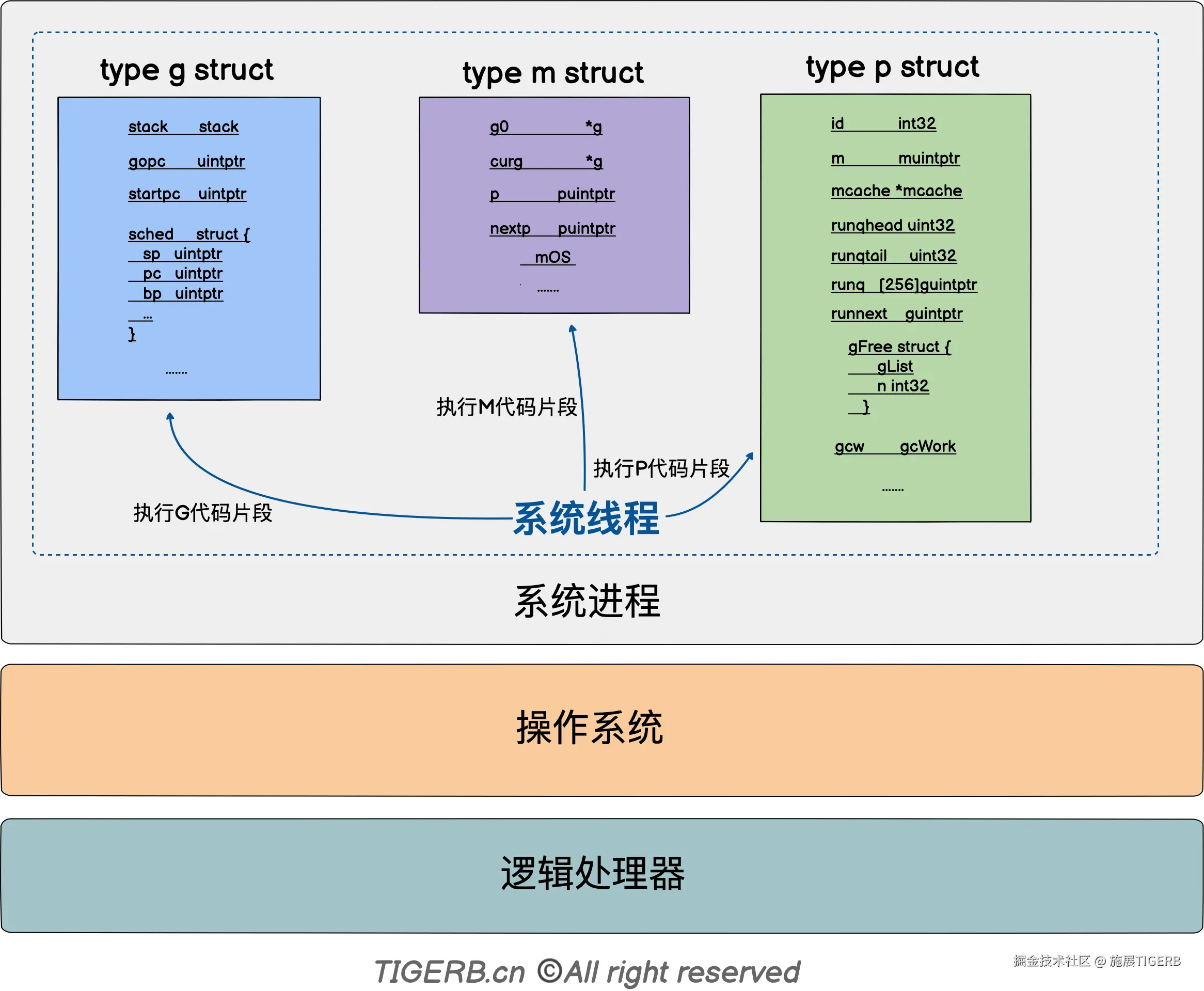 - 关于问题一,GMP是三个各司其职的结构体,被系统线程运行。