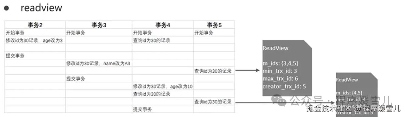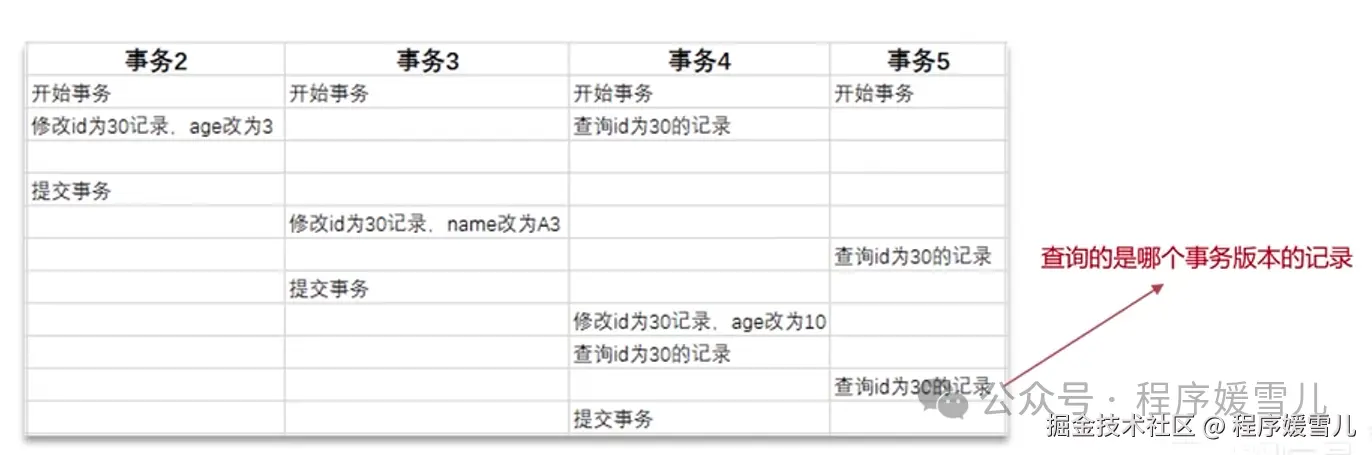 事务5中查询id为30的记录,根据访问规则+生成的readview,第一次查询读到的是事务2,第二次查询读到的是事务3