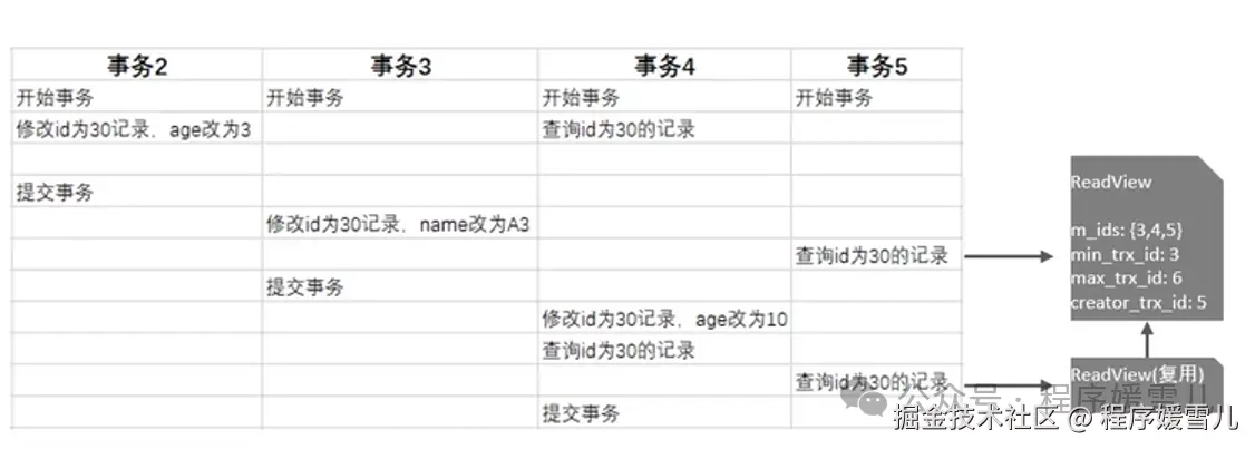 事务5中查询id为30的记录,根据访问规则+生成的readview,第一次读到的是事务2,第二次查询读到的还是事务2,因为复用的第一个ReadView。