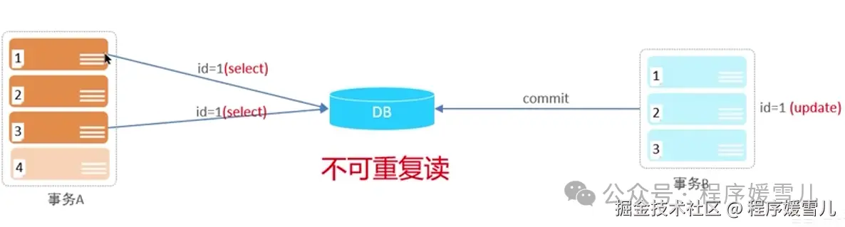 事务A第一次读到的是旧数据,第二次读这个数据前,这个数据已经被事务B改了,所以事务A第二次读到的数据和第一次读到的同一条数据不一样