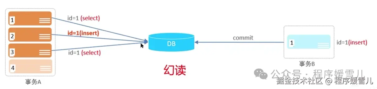 当事务A查数据库,发现id为1的数据没有,此时事务B把id为1的数据已经插入到数据库中,事务A再插入id为1的数据报错,再查id为1的数据,还是没有(因为解决了不可重复读,保证了两次数据一致)