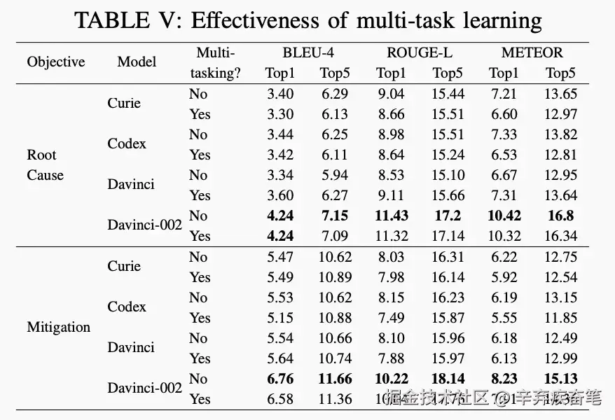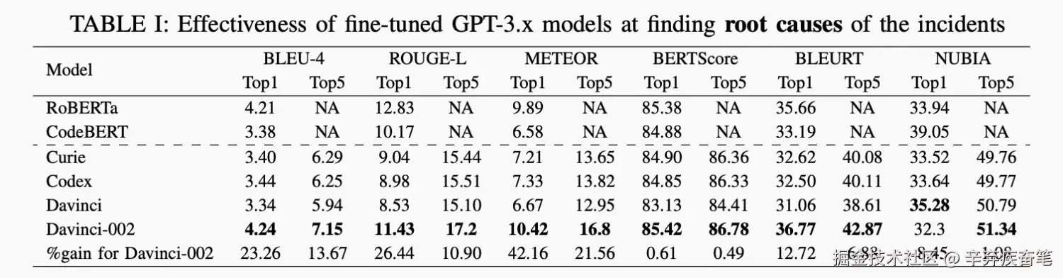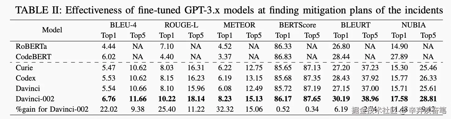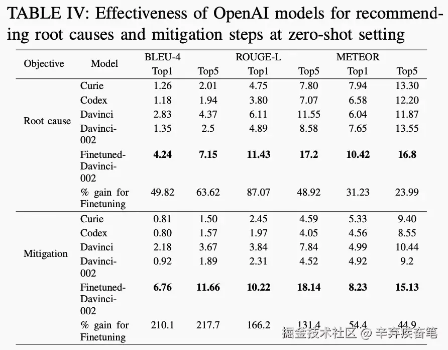 我们观察到与根本原因观察到的类似且一致的输出模式(表 III)。 编码器-解码器模型像以前一样生成通用评论(例如,“问题是自我缓解的”、“修复已部署到所有区域”),而这些建议对 OCE 来说大多无用。 对于 RQ1 和 RQ2,根据自动指标,经过微调的Davinci模型(即使有 1750 亿个参数)的性能明显低于其他基线方法。 然而,根据事件所有者的说法,Davinci 和 Code-davinci-002 模型是性能最好的模型