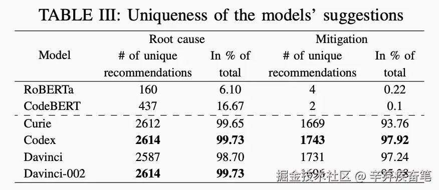 - 尽管 Davinci 模型在 RQ1 和 RQ2 中表现不佳,但它在根因和缓解方面的零样本设置下明显优于其他 OpenAI 模型。这是因为该模型具有更高的参数并且接受了更多数据的训练,使其能够在没有显式训练的情况下更好地推断。