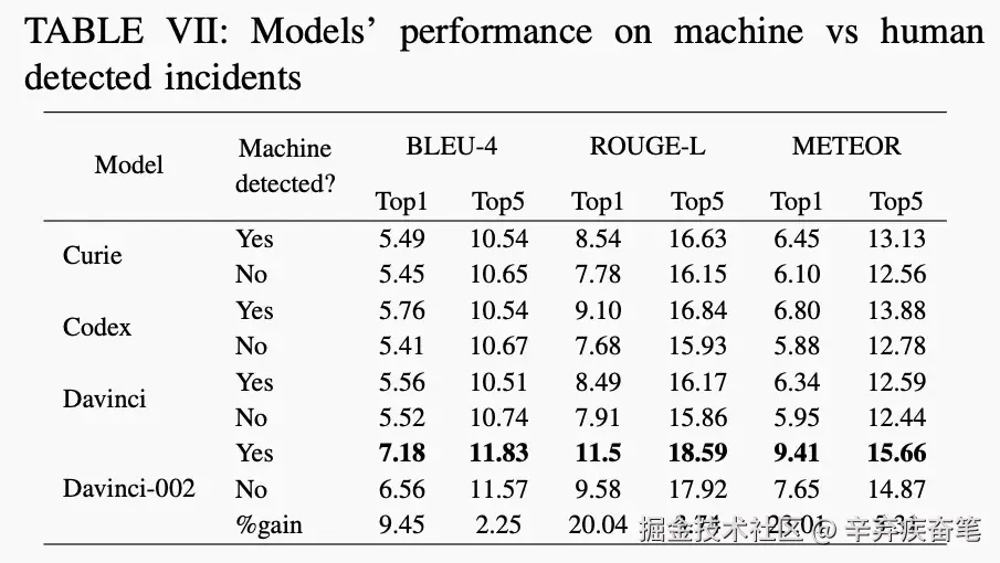 上表表明,在 Code-davinci-002 的 Top-1 建议的背景下,机器识别的事件可以优于人类检测到的事件,BLEU-4 为 9.5%,ROUGE-L 为 20%,METEOR 为 23% 模型。这是因为机器检测到的事件通常遵循某些模式,机器学习模型更容易识别这些模式。