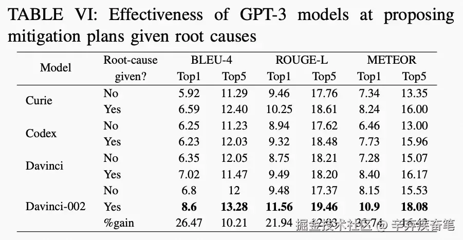 与 Top-1 结果的改进相比,Code-davinci-002 模型的 Top-5 推荐的性能提升并不大。 尽管如此,总体有希望的结果突出了根因信息在制定缓解计划中的重要性。