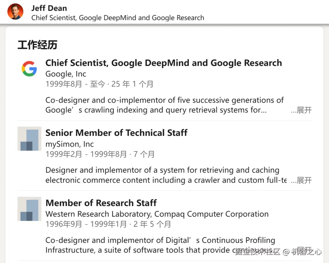 1999 年 8 月,Jeff Dean 加入了谷歌,成为早期第 20 号员工。他在 2011 年参与创立了 Google Brain 团队,专注于智能机器领域的进展。自那时起,他的工作重心转到了 AI 和 ML 领域的研究、系统和应用,并引领了更广泛 AI/ML 和计算机科学研究社区的发展方向。