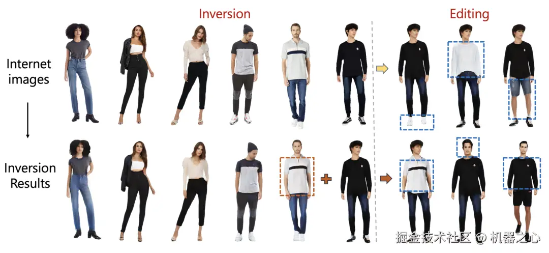 StructLDM 可对互联网图片进行编辑,首先通过 Inversion 技术得到对应的 UV latent,然后通过 UV latent 编辑可对生成的数字人进行编辑,如编辑鞋、上衣、裤子等。