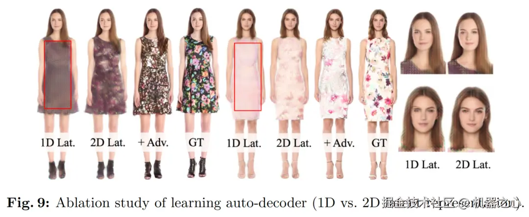 研究者对比了一维与二维 latent 人体表征效果,发现二维 latent 可生成高频细节(如衣服纹理及面部表情),加入对抗式学习可同时提高图片质量和保真度。