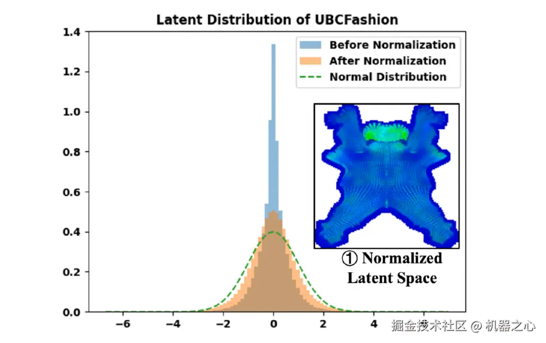 为提高扩散模型学习效率,StructLDM 提出了结构感知的 latent 归一化技术 (structure-aligned normalization),即对每个 latent 做逐像素归一化。研究发现,归一化后的 latent 分布更接近于高斯分布,以此更利于扩散模型的学习。