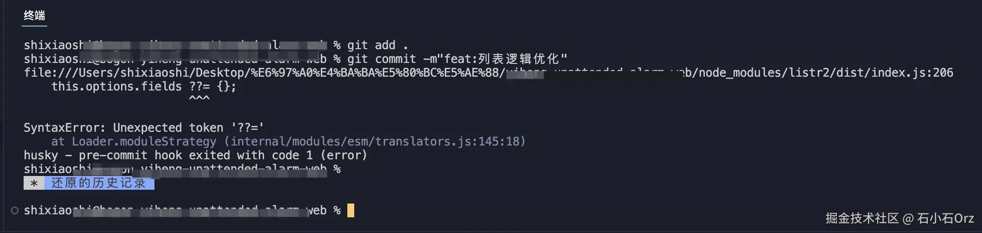 现在,我们每次提交代码时,Git 会在提交前运行这个 pre-commit 脚本。如果脚本发现 console.log 语句,提交将被阻止,并显示错误信息。