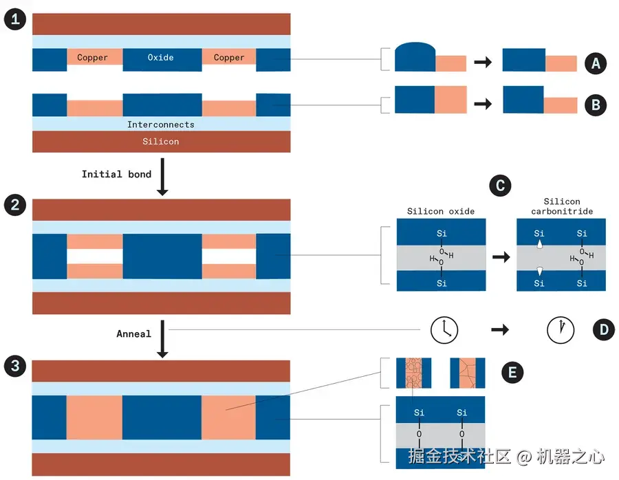 在混合键合中,铜 pad 建立在每个芯片的顶面上。铜被绝缘层(通常是氧化硅)所包围,pad 本身略微凹进绝缘层的表面。在对氧化物进行化学改性后,将两个芯片面对面压在一起,使每个凹陷的 pad 对齐。然后慢慢加热这个夹层,使铜膨胀到间隙处并熔合,从而连接两个芯片。