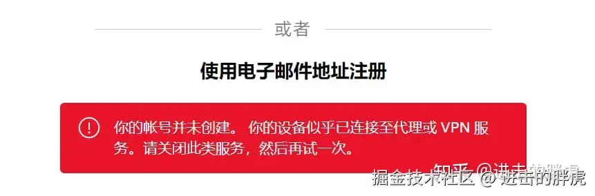 本以为立马就可以注册成功了,在点击注册后坑爹的提示:你的帐号并未创建。 你的设备似乎已连接至代理或 VPN 服务。请关闭此类服务,然后再试一次。如下: