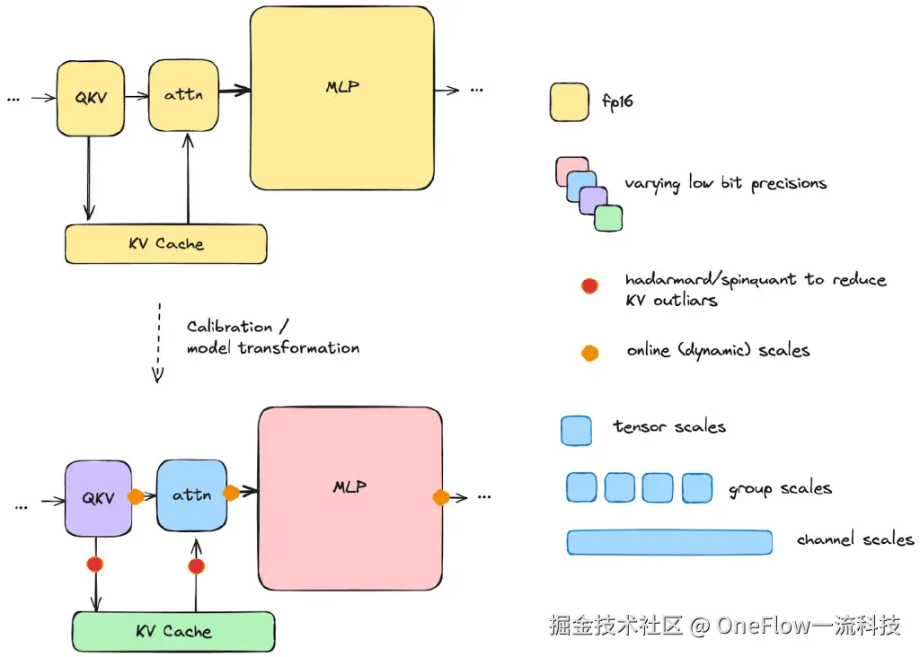 - 多种可能的量化技术,其激进程度各不相同。例如,我们可能会使用SmoothQuant、GPTQ以及异常值减少变换(如Hadamard、SpinQuant)等技术来将量化模型的质量最大化。扩展因子的粒度可以从每个整个张量一个到每个小值组一个不等。在运行时,量化模型可能会使用在线Hadamard技术来减少KV缓存的不一致性,或使用在线扩展来进行线性变换。