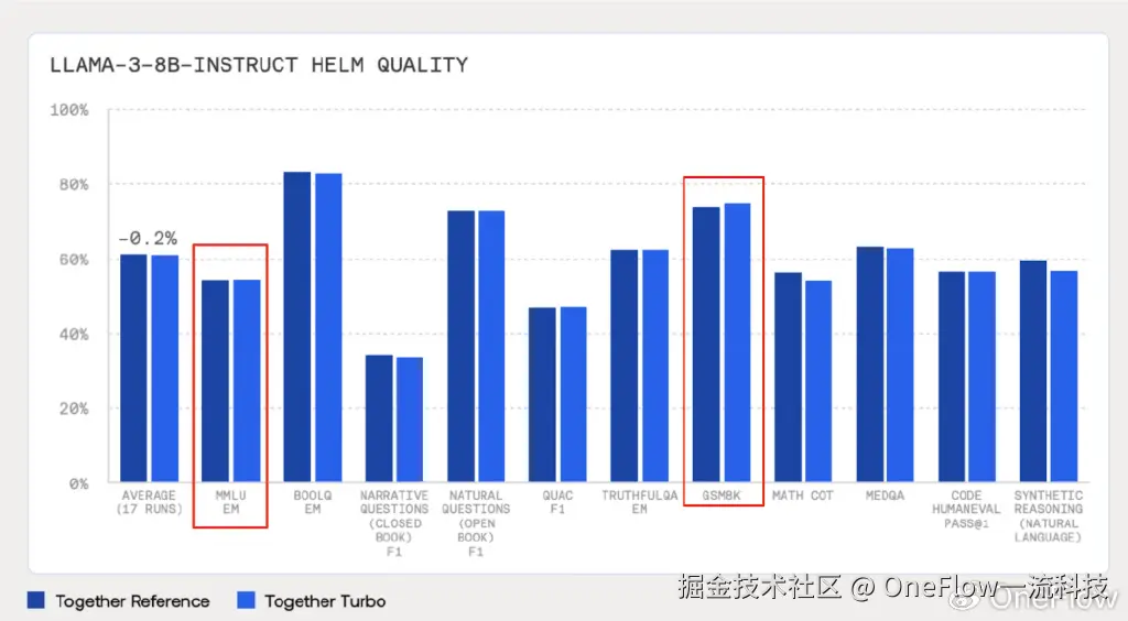 这种全有或全无的方法导致了大量的不准确性。例如,我们发现量化模型在某些基准测试中的质量有时会有所提高。例如,在下图来自TogetherAI的示例中,量化模型(Turbo)在GSM8K和MMLU EM上的结果实际上比非量化模型高出几个百分点。