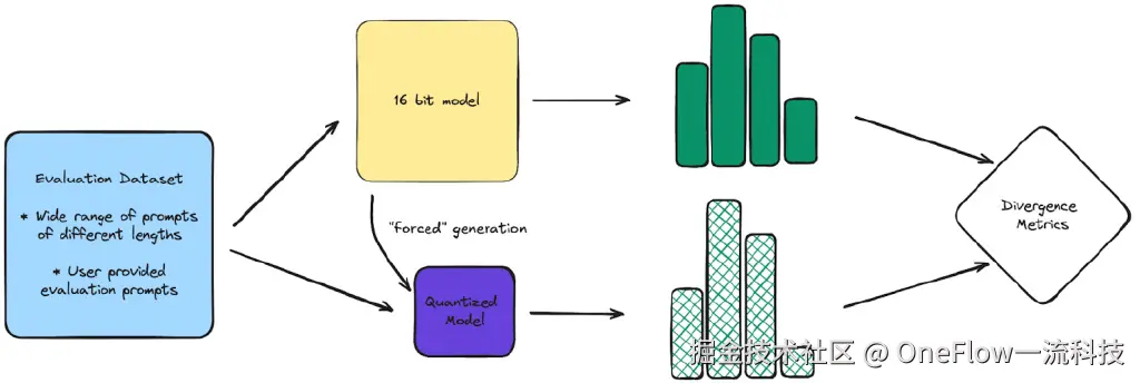 3. “强制”量化模型生成和分布创建:然后,我们在相同的提示上运行量化模型并构建一个类似的分布。重要的是,即使量化模型倾向于选择其他词元,我们仍然坚持使用参考模型所生成的输出。这可以防止量化模型生成一个完全不同的结果,这个结果可能质量较差但困惑度指标(例如,重复性)很好。