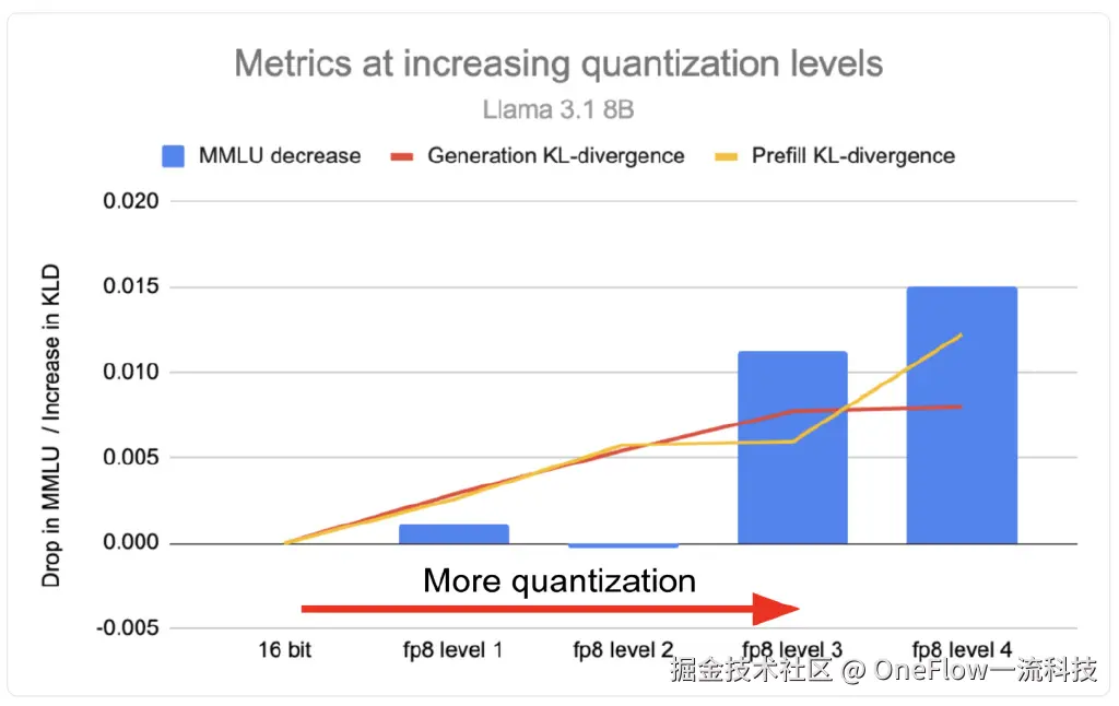 如何衡量量化后的模型质量?由于质量取决于具体的使用场景,所以开发者还是评估其应用程序质量的最佳人选。然而,为了衡量模型的综合质量,我们更倾向于关注散度指标(量化对特定模型输出的改变程度),而不是单纯的能力指标(例如量化模型在通用基准测试如MMLU上的分数)。