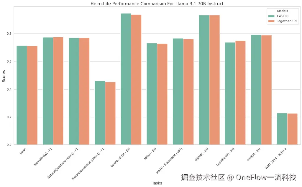 我们使用Helm-Lite评估套件(crfm.stanford.edu/helm/lite/l… 3.1 70B进行了测试。随着Llama 3.1的发布,Meta发布了包含完整格式提示的官方参考评估(huggingface.co/datasets/me…