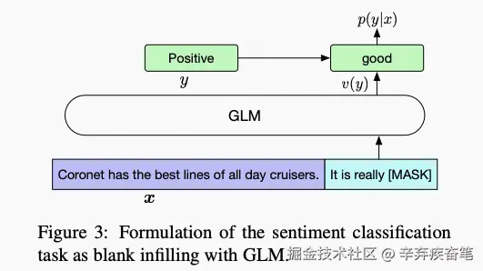 对于一个给定标签的样本,把文本x设计成单个词的完形填空问题,其中 y 表示完形填空的结果。